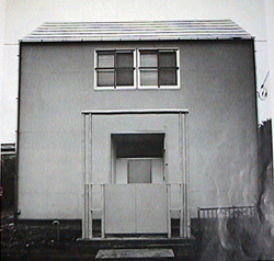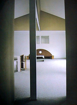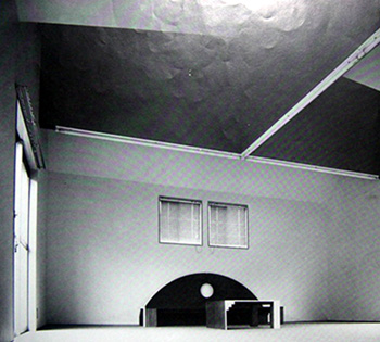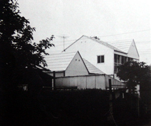 直行する切妻形態 その親子の結合 親 住いの機能に満たされる 子 なにもない空間 シンボリックな巨大T型の梁による無柱空間